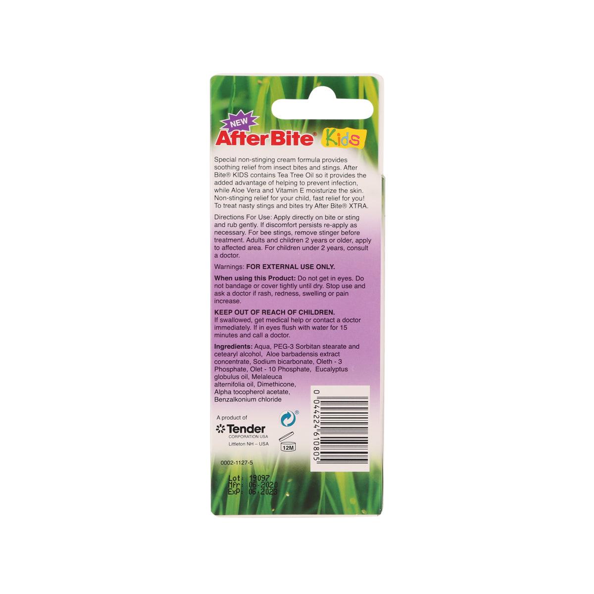 Temporarily protects and helps relieve minor skin irritation and itching due to: insect bites; poison ivy, oak or sumac. This gentle, non-stinging cream provides immediate soothing relief from the pain, itching and swelling of insect bites and stings. AfterBite KIDS contains baking soda, aloe vera and tea tree oil to help soothe and moisturize the skin. Be ready for mosquitoes, black flies, fleas, ticks and other bites.